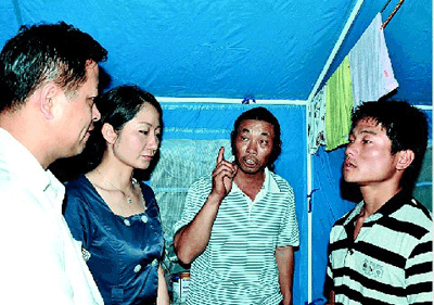 桑樂公司將滿滿的幾車救災(zāi)物資交到災(zāi)民安置點后,隨相關(guān)負(fù)責(zé)人一同進入集中安置點進行慰問。耿剛等人看到一座座藍(lán)色的災(zāi)民帳篷,災(zāi)民圍坐帳篷邊,心情十分沉重。當(dāng)他們走到