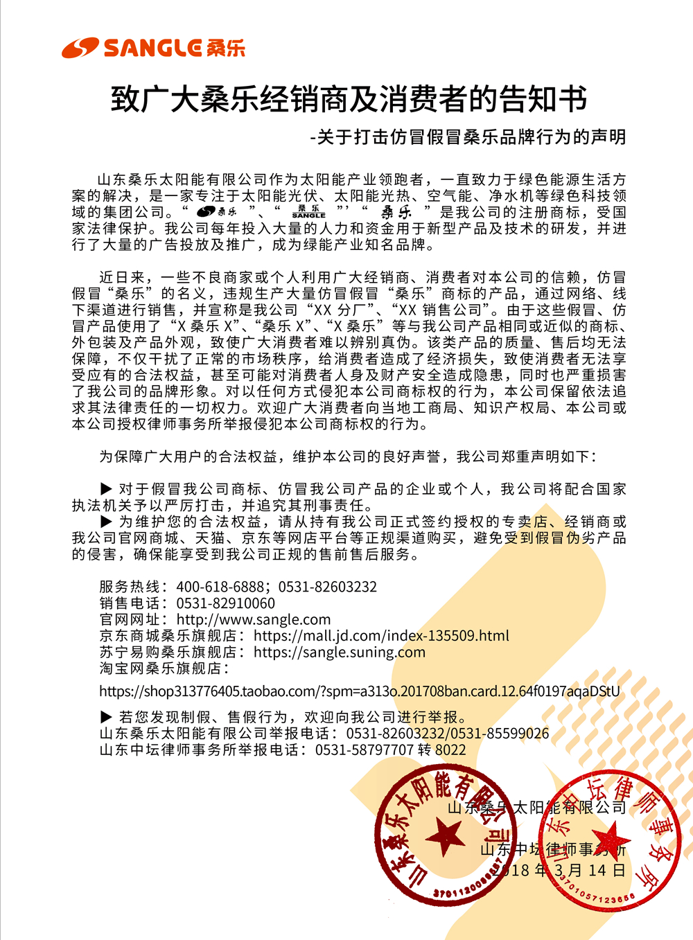 關(guān)于打擊仿冒假冒桑樂品牌行為的聲明