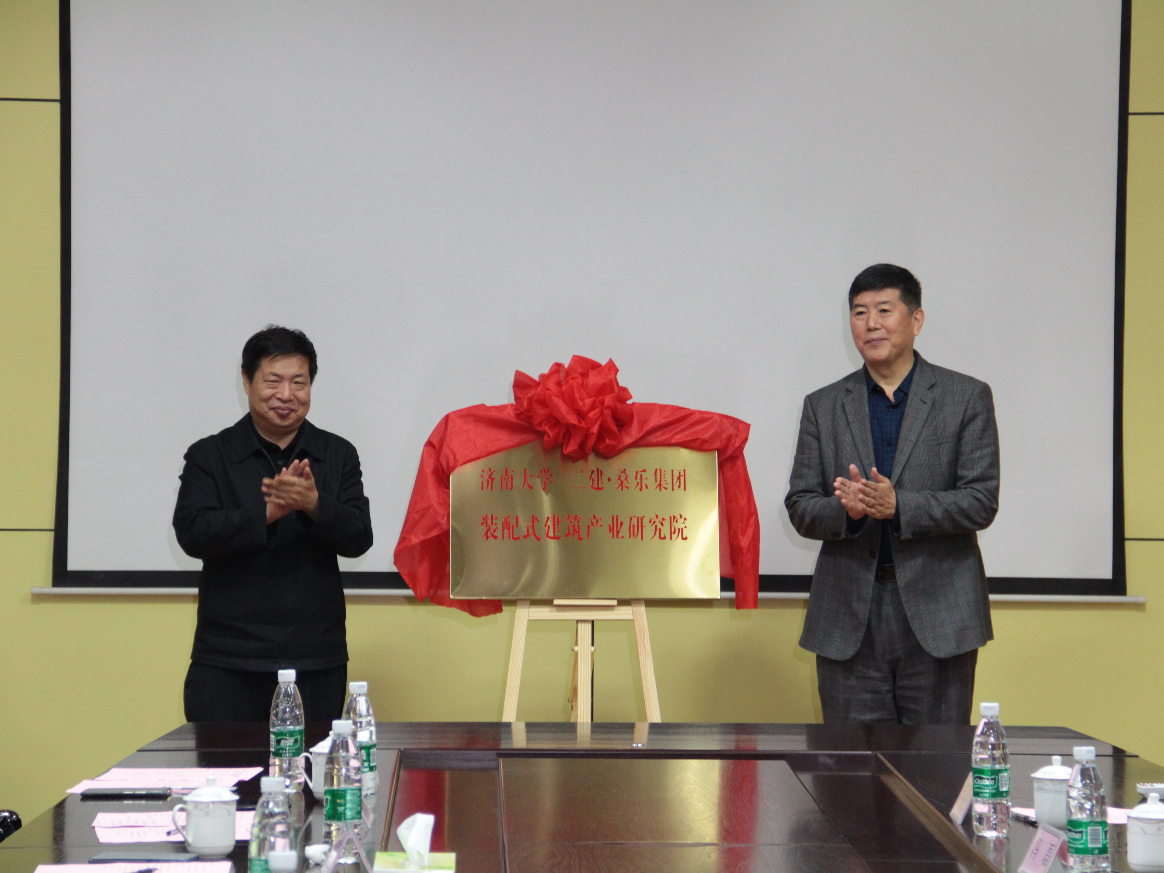 濟(jì)南大學(xué)黨委書記徐景顏與集團(tuán)董事長王雪廣共同為濟(jì)南大學(xué)、二建.桑樂集團(tuán)裝配式建筑產(chǎn)業(yè)研究院揭牌